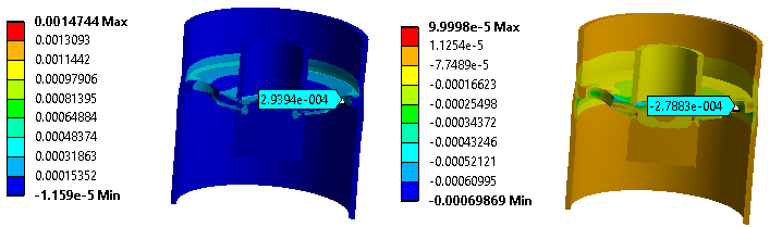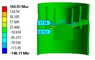 得到了下面的結(jié)構(gòu)與結(jié)果,看起來不錯,第一主應(yīng)變和第三主應(yīng)變達(dá)到近300微應(yīng)變。采用兩片半橋片(通常用于測量Mx的那種)就可以組成全橋了。但這只是原理罷了,在這種曲面上貼片也許對于貼片人員來說是一種挑戰(zhàn)!