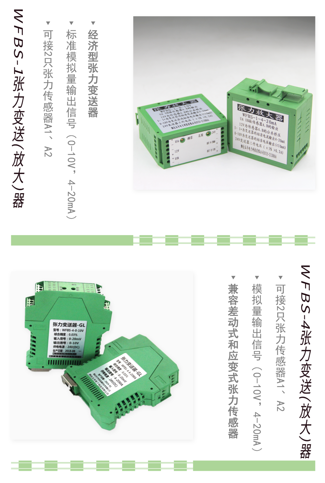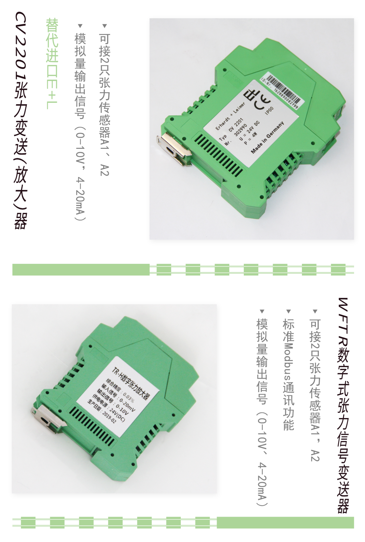 張力信號放大器用于從張力傳感器讀取張力信號(常規(guī)為0-20mVDC),經(jīng)過變送器的預(yù)處理,即采用固定增益系數(shù)對信號進行放大,然后經(jīng)由A/D轉(zhuǎn)換電路換成標(biāo)準(zhǔn)的模擬量信號輸出給控制器、變頻器、PLC或終端處理系統(tǒng)等。